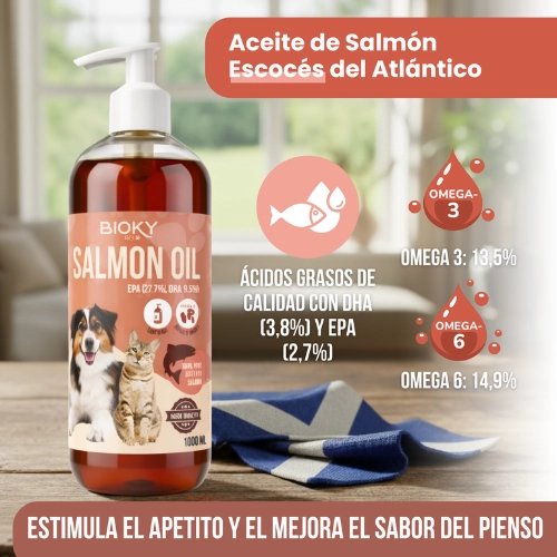 - Beneficios cognitivos y visuales: En animales jóvenes, el aceite de salmón puede contribuir al desarrollo óptimo del sistema nervioso y la visión, mientras que en adultos ayuda a preservar la función cognitiva.